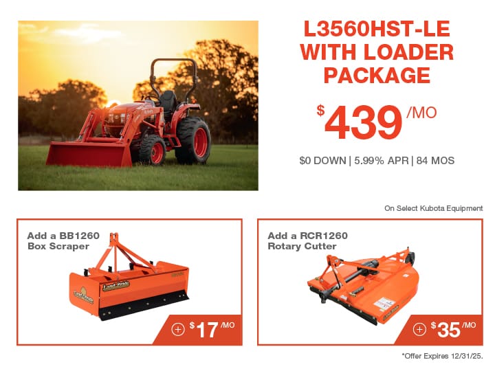 DISCLAIMER $0 Down, 5.99 % A.P.R. financing for up to 84 months on purchases of new Kubota B Series equipment from participating dealers’ in-stock inventory is available to qualified purchasers through Kubota Credit Corporation, U.S.A.; subject to credit approval. Example: 84 monthly payments of $14.60 per $1,000 financed. Customer instant rebate of up to $3,500 with cash or standard rate financing on Kubota B Series Equipment. Customer Instant Rebate is not available with 0% A.P.R. or other promotional financing. Offers expire 12/31/25. Terms subject to change. Taxes and insurance are not included. For complete warranty, disclaimer, safety, incentive offer and product information, consult your Dealer or KubotaUSA.com.